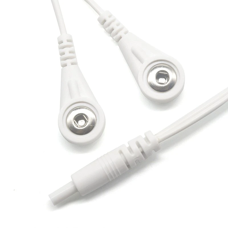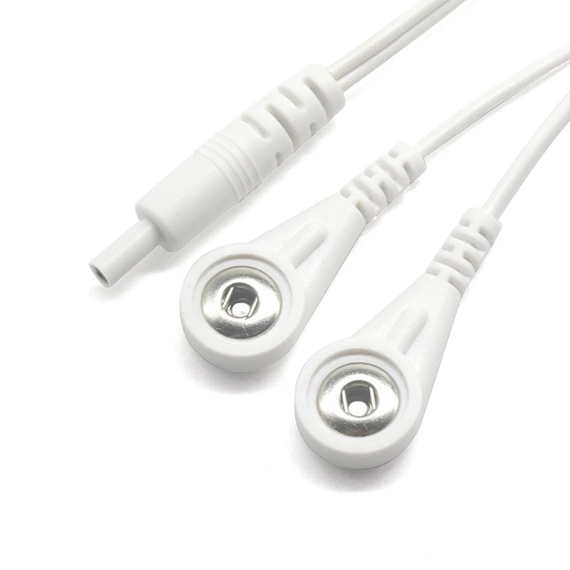 El cable presenta un enchufe de seguridad DC 2.35 mm en un extremo para un accesorio seguro a su equipo, y dos conectores SNAP femeninos de 3.5 mm en el otro extremo para una conexión rápida y confiable a las almohadillas de electrodos. El aislamiento de PVC/TPU de grado médico mejora la flexibilidad, la durabilidad y la comodidad del paciente.