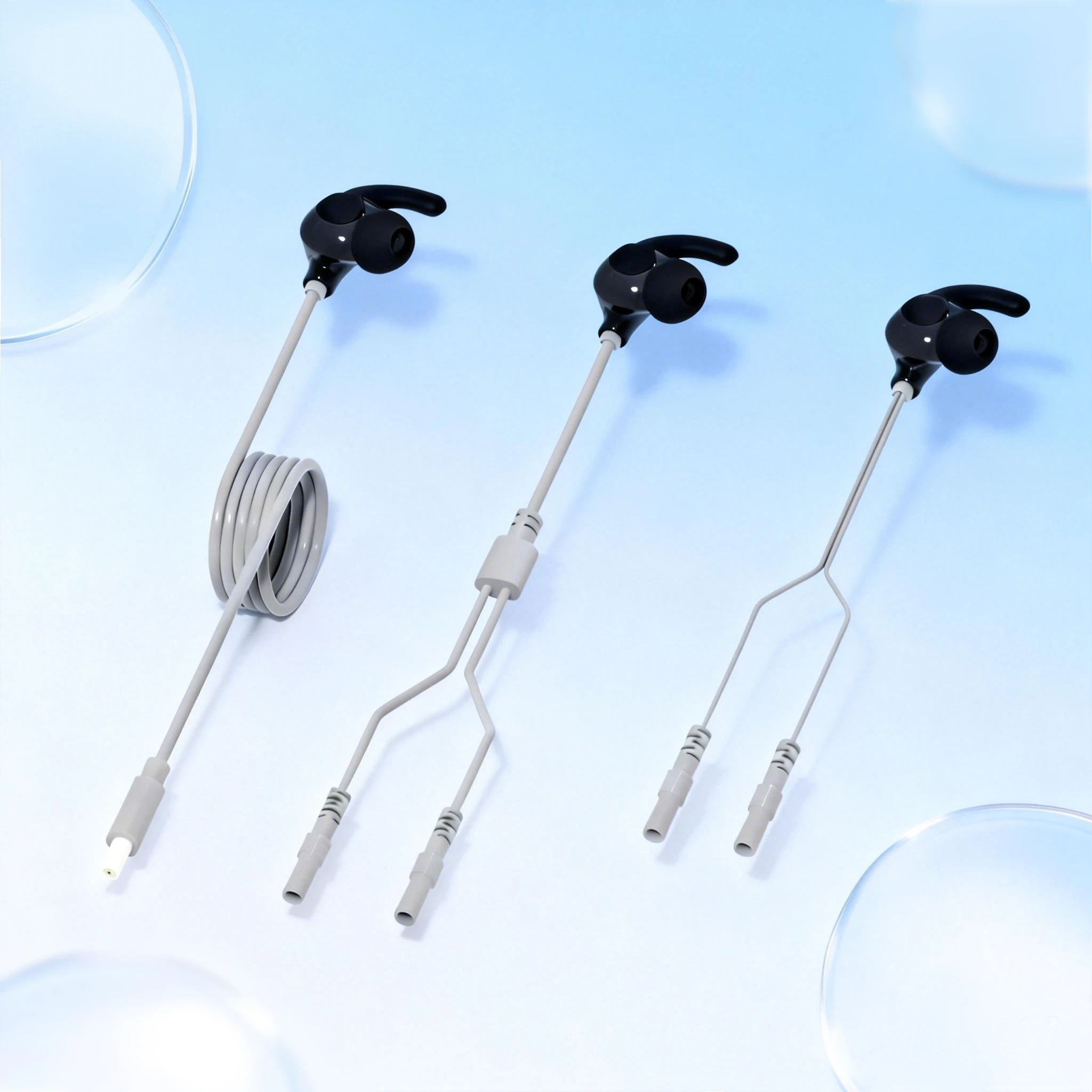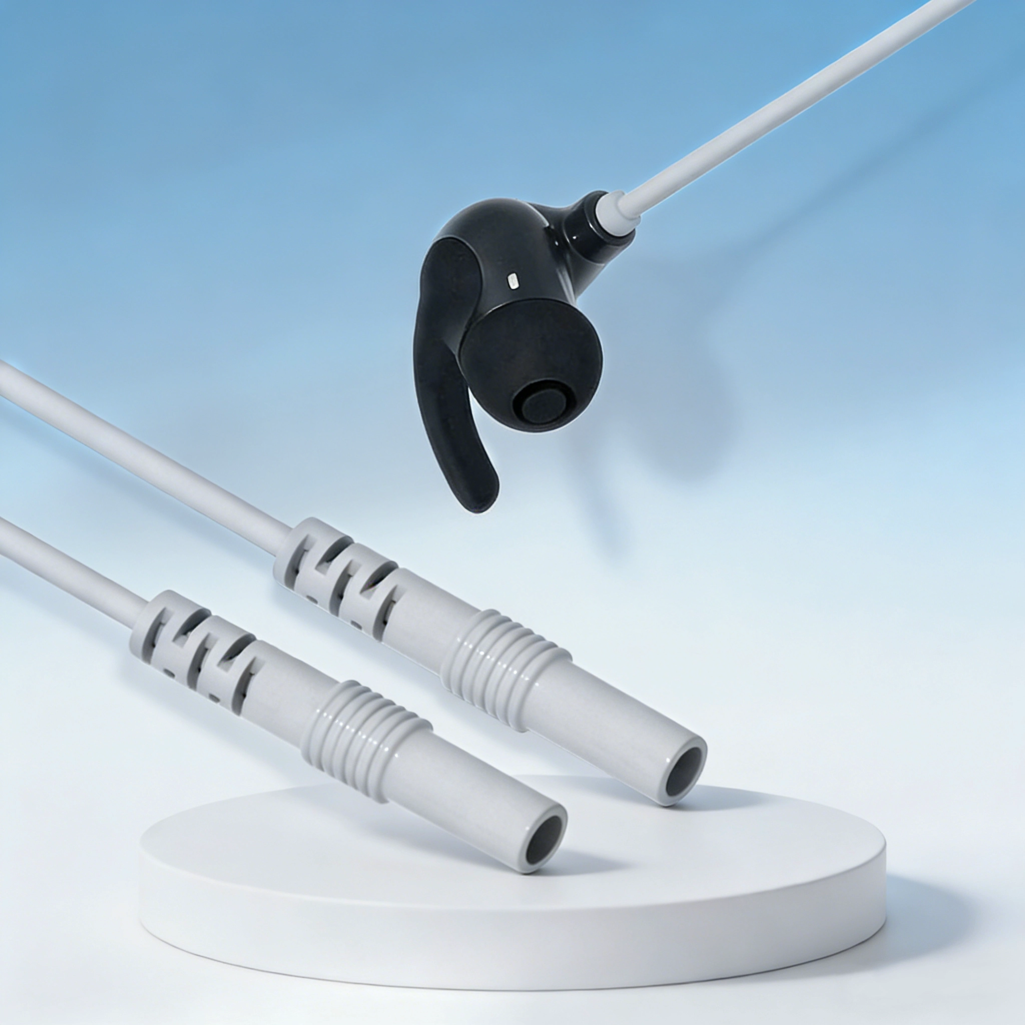 This premium electrode cable assembly bridges the gap between your stimulation device and the patient, enabling effective and comfortable auricular vagus nerve stimulation. The custom-molded silicone ear piece ensures a secure and anatomically correct fit within the ear, providing stable electrode contact for reliable therapy delivery. The integrated electrodes are made from skin-friendly, conductive materials to minimize irritation, reflecting our commitment to quality across all our medical-grade cable assemblies.